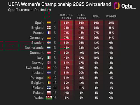 England are among the favourites to win the tournament, with the Opta supercomputer giving them a 16.1% chance of becoming just the second team to win the Euros in back-to-back editions after Germany, who have done so twice.