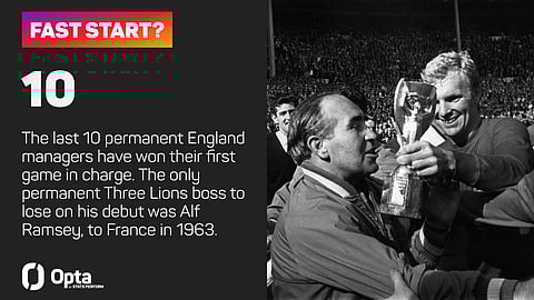 The only permanent manager to lose his first game was World Cup-winning boss Alf Ramsey in 1963, versus France.