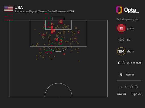 Smith, meanwhile, had a tournament-leading 27 shots, six more than second-best Spain's Salma Paralluelo (21), while Rodman ranked third on 19, and Swanson joint-fifth on 17. Smith created 10 chances, but her 1.96 xA was the highest at the Paris Games.