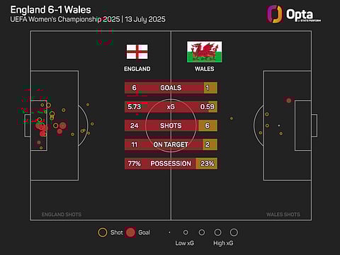 England eased some of the pressure in the second half, though Mead slotted home their fifth 72 minutes in, with Wales netting a consolation four minutes later through substitute Hannah Cain, much to their supporters' jubilation.