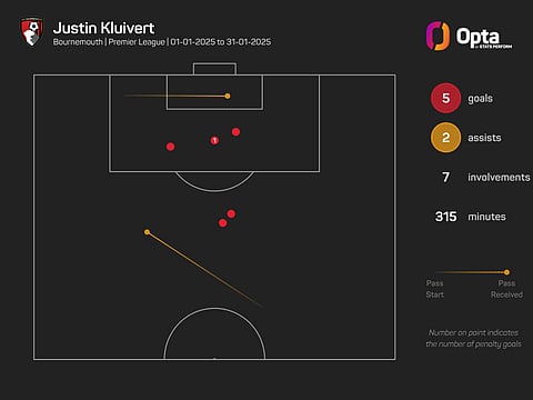 No player was involved in more Premier League goals in January than Kluivert (seven – five goals, two assists), as he recorded a goal involvement every 45 minutes across the month.