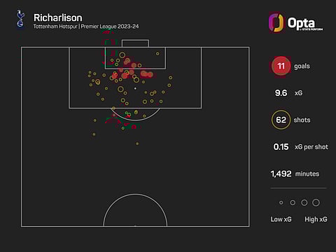 Richarlison's 11 league goals last term came from a total of 62 shots worth 9.59 expected goals (xG), while he hit the target with 53.2% of his efforts and netted with 17.7%.