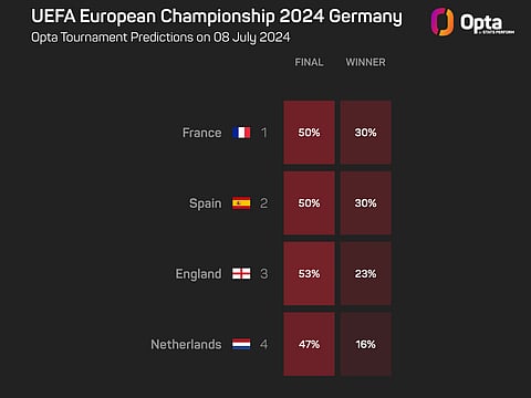 The Opta supercomputer makes France (30%) and Spain (30%) favourites to lift the trophy on Sunday, ahead of England (23%) and the Netherlands (16%) on the other side of the draw.