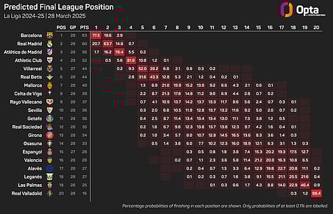 Atletico are now given just a 1.7% chance of winning the league by the Opta supercomputer, with Barcelona the most likely to win at 77.5%, while Madrid's chances sit at 20.7%.
