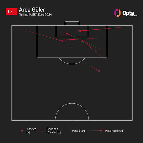 Arda Guler has been a shining light throughout their campaign. The 19-year-old provided his second assist of the Euros for Samet Akaydin's opener, becoming the second teenager to tee up multiple goals at this edition after Lamine Yamal (three).
