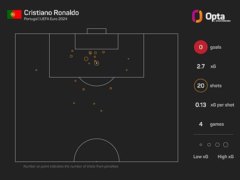 He has had 20 shots worth 2.7 xG overall at Euro 2024, the most attempts at the tournament and the fifth-most without netting at any edition of the competition, after Deco in 2004 (24), Fernando Hierro in 1996 (23), Kevin De Bruyne in 2016 and Dani Olmo at Euro 2020 (both 21).