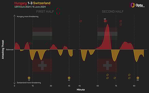 Breel Embolo's cool, late lob sealed victory to leave Hungary with just two wins from their 12 matches at the European Championships (D4 L6), a win rate of 17 per cent. Among nations with five-plus games at the finals, only Romania (six per cent) and Poland (14 per cent) have a lower success ratio.