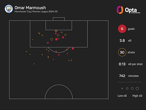 Marmoush has scored six goals in his first 10 Premier League appearances for City, having 15 shots on target in this time, seven more than any of his team-mates.