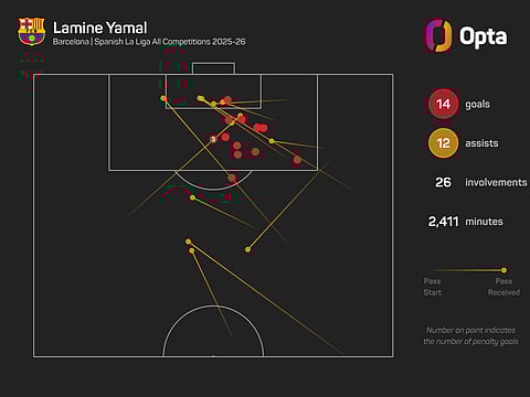 In 2025-26, he leads the way for assists (14) and chances created (84) among Barcelona players, while only Ferran Torres (16) has netted more than his 14 goals.