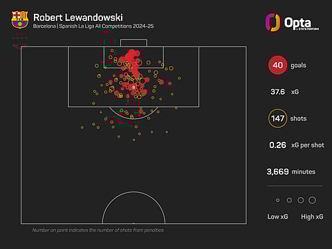 In all competitions, he has netted 40 goals, at least 10 more than Raphinha (30). His tally has come from 147 shots worth 37.56 expected goals (xG). He boasts a 27.21% shot conversion rate.