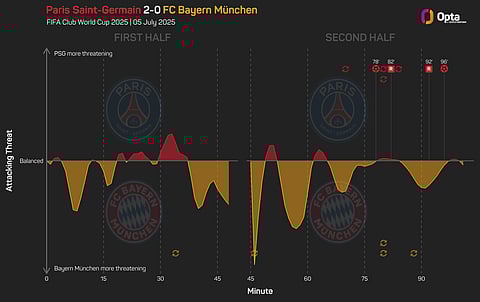 Despite finishing the game with nine players, PSG comfortably won the expected goals battle, creating 2.0 xG to Bayern's 0.6.