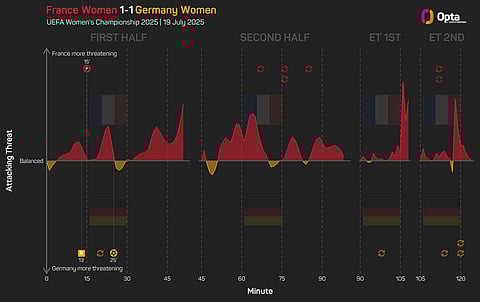 Les Bleues had dominated throughout the 120 minutes, though, recording 2.1 expected goals (xG) from their 18 shots, with nine on target.
