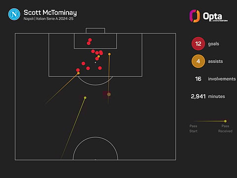 No midfielder scored more goals than McTominay in Serie A, with his haul coming from 7.4 expected goals (xG), an overperformance of 4.6. He also scored the opening goal in eight matches, more than any other player.