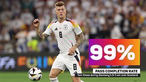 Kroos began his final tournament with a metronomic performance against Scotland, completing 101 of his 102 passes for the highest pass completion rate (99 per cent) of any player to ever attempt 100 passes at a Euros match.