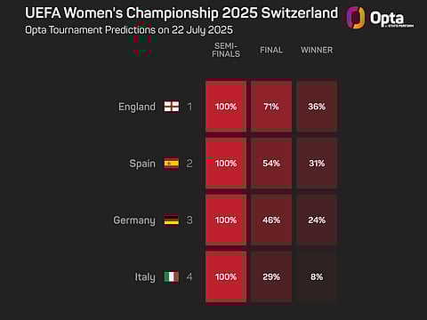 Spain were the favourites to win the title prior to the tournament, according to the Opta supercomputer, but they have now dropped to second.
