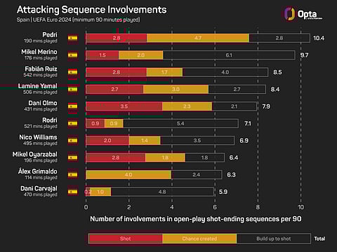 His five goal involvements (three goals, two assists) were also the most by a Spaniard at a major tournament since David Silva at Euro 2012 (two goals, three assists).
