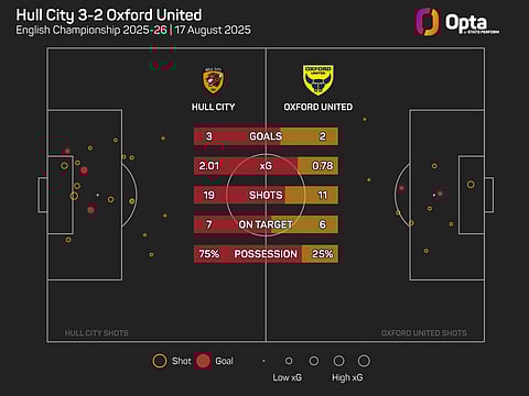 It was ultimately a deserved win for Hull, who had 19 shots to Oxford's 11 and amassed 2.01 expected goals (xG) to their opponents' 0.78, also enjoying a 74.5% possession share.