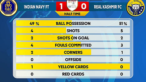 The first half ends with Indian Navy ahead, courtesy Vijay Marandi's sixth-minute goal. Real Kashmir tried their best to equalise in the latter stages of the half, but lacked clinicality in the final third. Check out the first-half stats below: