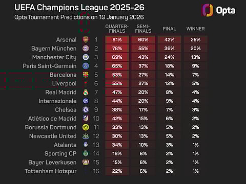 They are given a 90.3% chance of clinching a first league title since 2004, while their hopes of lifting Europe's top prize sit at 25%.