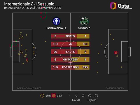 Indeed, Inter registered an expected goals (xG) total of 1.81 from their 20 shots, only six of which were on target, compared to Sassuolo's 0.9 from nine attempts at goal.