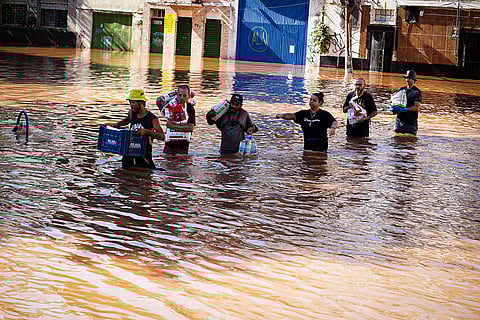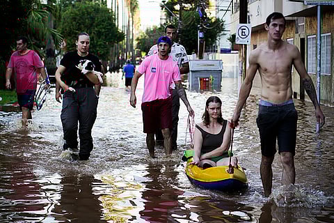 People wade through an area flooded by heavy rains in Porto Alegre, Rio Grande do Sul state, Brazil.