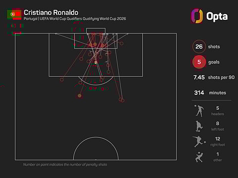 Only two players have attempted more shots during UEFA World Cup qualifying than Ronaldo (26), who has five goals in four appearances, though he had a penalty saved by Caoimhin Kelleher in the reverse fixture.