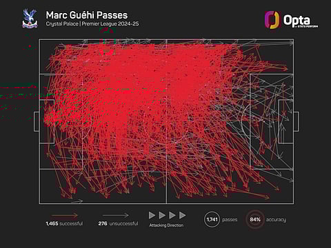Since joining Palace in July 2021, no player has played more successful passes (8,093), made more clearances (609), won more aerial duels (276) and made more interceptions (149) than Guehi for the Eagles in all competitions.