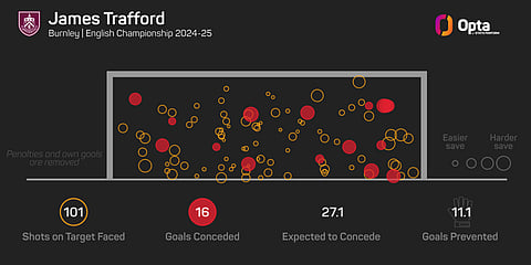 According to Opta's expected goals on target (xGoT) model, Trafford's shot-stopping prevented 11.1 goals last season, as he was beaten just 16 times from shots with an xGoT value of 27.1.