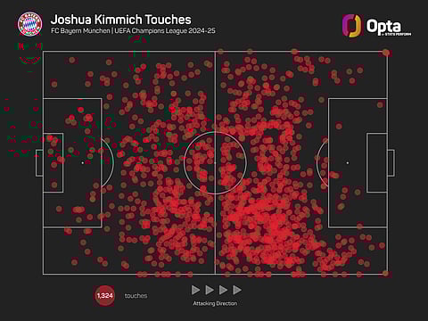 Kimmich has played the most passes (1,103) and had the most touches (1,324) of any player in the Champions League this season.
