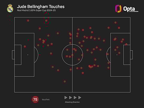 Playing in a slightly deeper position than that he occupied in his first campaign in Spain, Bellingham enjoyed the most touches (75) and created the most chances (three) of any Madrid player.