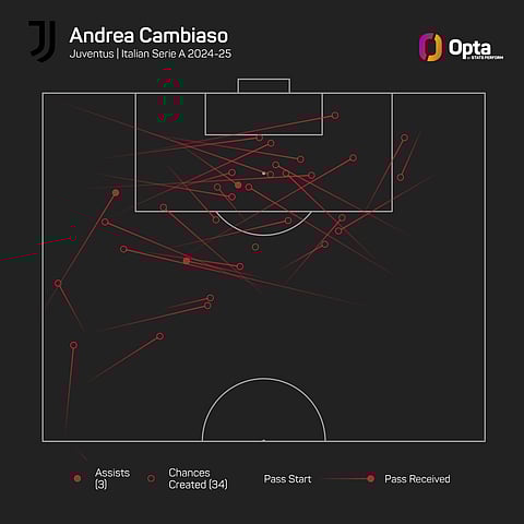 Only Manuel Locatelli (78) made more tackles than Cambiaso's 38 among Juve players last campaign, while only Khephren Thuram, Dusan Vlahovic (both five each) and Kenan Yildiz (six) provided more assists.