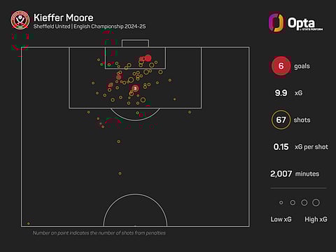 He scored six goals, though those efforts came from chances worth 9.9 expected goals (xG) as the Blades fell short of promotion, losing to Sunderland in the play-off final.