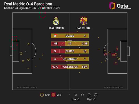 The match stats were all in Barca's favour, painting the picture of a dominant display. The visitors had 15 shots to Madrid's nine, got seven of those on target and accumulated 2.45 expected goals (xG) to Los Blancos' 1.48.