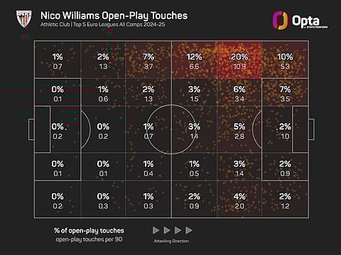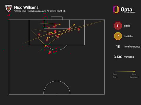 Williams registered 18 goal involvements in all competitions for Bilbao last season, scoring 11 and assisting seven, while also completing more than twice as many dribbles (124) than any of his team-mates (brother Inaki Williams was second with 55).