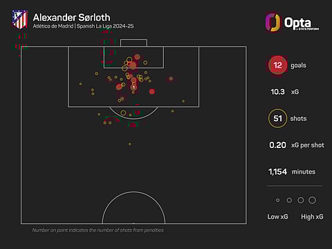 Only Alvarez (14) has netted more goals this term, but Sorloth (23.53%) boasts a better shot conversion rate than the Argentinian (21.88%), scoring his haul from 51 shots.