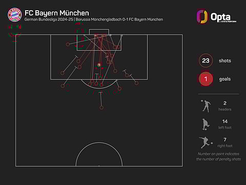 Bayern have now scored in each of their last 23 games in the Bundesliga, netting 64 goals in that run. However, they had 23 shots against Gladbach, accumulating 3.27 expected goals (xG), with Kompany insisting their win margin should have been ever higher.