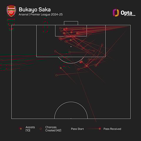 Saka has been the creative force for Arsenal at the top end of the pitch this season, registering nine goals and laying on a further 13 assists in 24 appearances in all competitions.