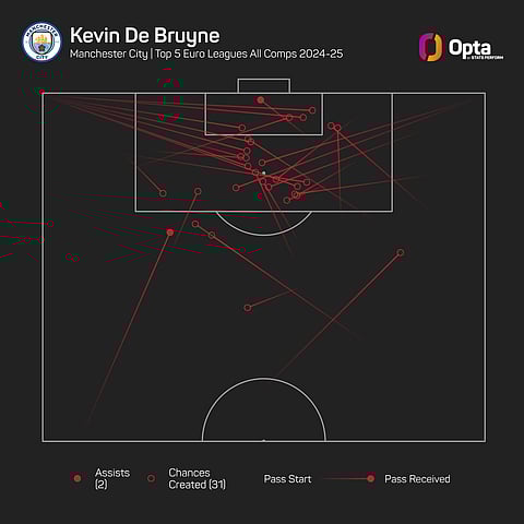 In all competitions, De Bruyne is averaging 0.2 goals, 0.2 assists and 3.11 chances created per 90 minutes this term, with all of those figures being his worst in any season since at least 2017-18.