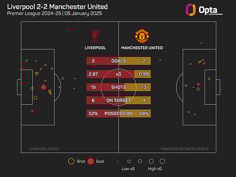 United remain winless in their last 10 away games against Liverpool in all competitions (D5 L5), their longest-ever such run. However, they scored as many goals on Sunday as in their previous 10 such away games at Anfield beforehand combined (two).