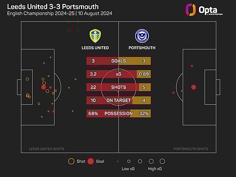 Leeds dominated for long periods and should have killed the game off, finishing with 22 shots to Portsmouth's five and 39 touches in the penalty area to the visitors' six.