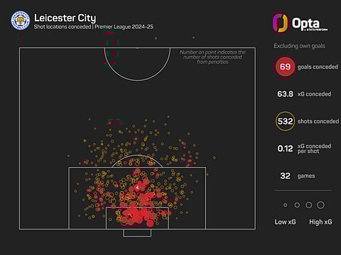 Leicester have scored 27 goals from a league-low 27.8 xG. Only three teams - Southampton, West Ham and Manchester United - have a lower shot conversion rate than the Foxes (9.44%).