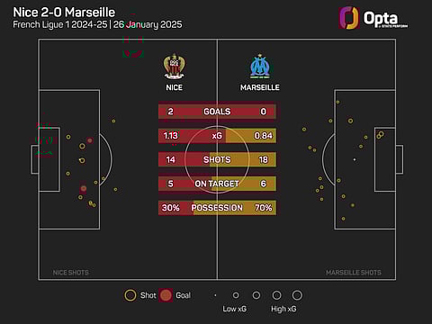Marseille faltered in their pursuit of Paris Saint-Germain at the Ligue 1 summit after falling to a 2-0 defeat to Nice at Allianz Riviera on Sunday. (More Football News)