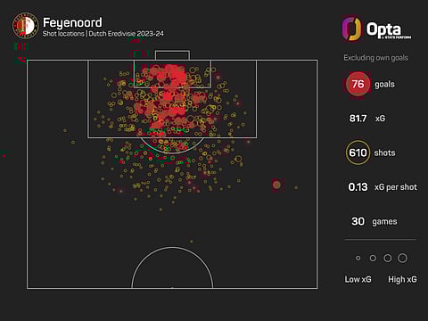 His Feyenoord team have scored 329 goals, an average of 2.2 per match, conceding 147 in return. Slot's points per game is a hugely impressive 2.13.