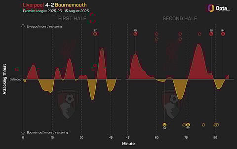 In the second half, Bournemouth almost matched Liverpool's expected goals (xG) figures, generating 0.87 to the Reds' 0.89, with the Cherries also turning 20 final-third entries into 18 touches in their opponents' area.