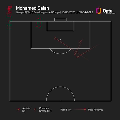 And it's not as if Salah has been providing for his team-mates, either, only averaging 0.93 chances created and 0.09 expected assists (xA) in his last four games, having previously averaged 2.2 chances created and 0.25 xA this season.