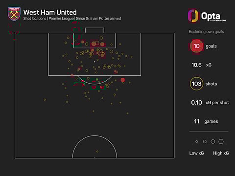 Per Premier League game, Potter's West Ham are averaging fewer goals (one to 1.18), xG (0.94 to 1.39), shots (9.5 to 14.5) and shots on target (2.67 to 4.27) than Lopetegui's Hammers did.