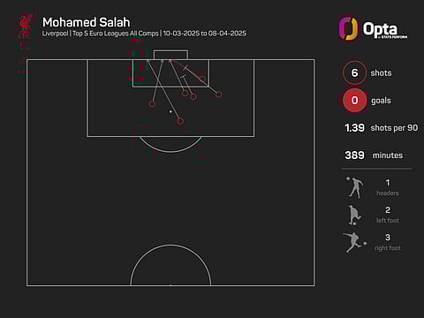 Salah has averaged 1.39 shots, 0.46 shots on target and 0.25 expected goals (xG) per 90 minutes in this spell, having managed 3.62 shots, 1.81 shots on target and 0.72 xG per game between the start of the season and the first game in this run.