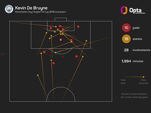 Since his debut in the competition in January 2016, De Bruyne has been involved in more FA Cup goals (first round onwards) than any other player (28 – 10 goals, 18 assists).