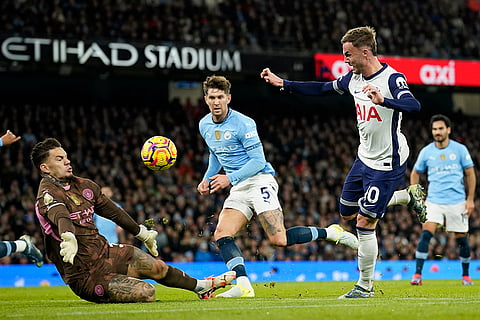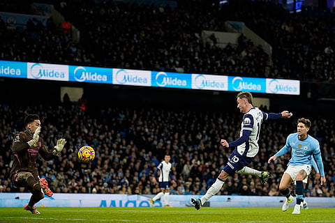 Tottenham's James Maddison, centre right, scores his side's second goal during the English Premier League soccer match between Manchester City and Tottenham at the Etihad Stadium in Manchester, England.