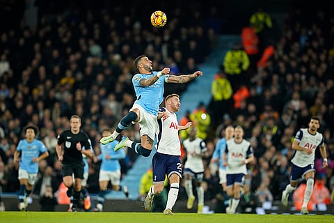 Manchester City's Kyle Walker, centre left, jumps for the ball above Tottenham's Brennan Johnson during the English Premier League soccer match between Manchester City and Tottenham at the Etihad Stadium in Manchester, England.